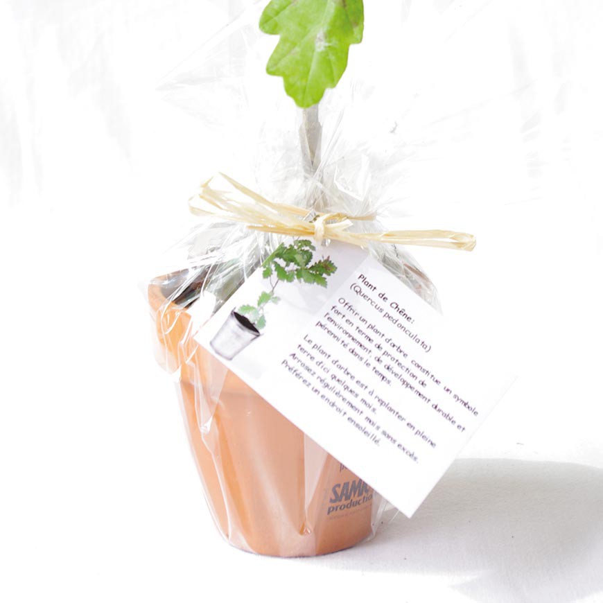 Plant d’arbre publicitaire en pot terre cuite de 8cm personnalisé avec une étiquette imprimée en quadri recto verso, format 6x8cm.