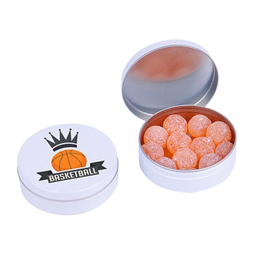 Boîte de bonbons publicitaire personnalisée au recto verso, diamètre 47 mm.