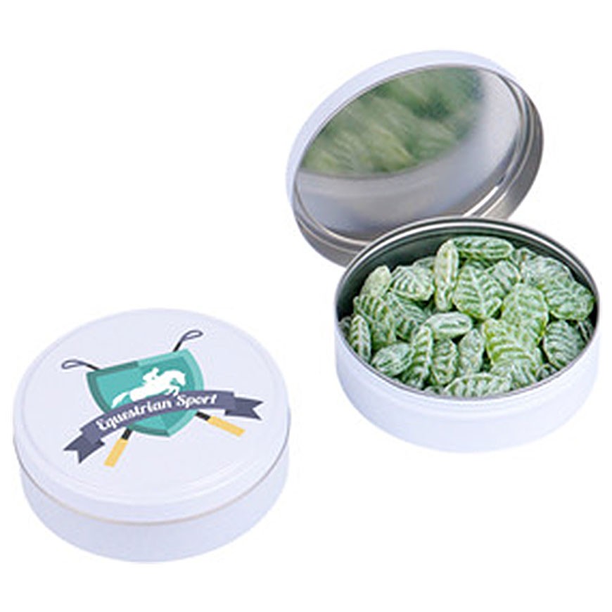 Boîte de bonbons publicitaire personnalisable au recto verso, diamètre 70mm.