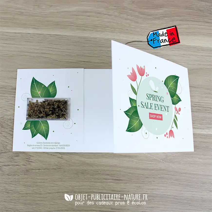 Le graphiste d’Objet Publicitaire Nature peut vous proposer en option une maquette pour votre carte de voeux avec capsule de graines.