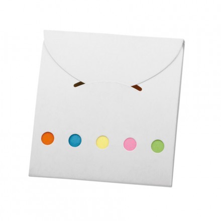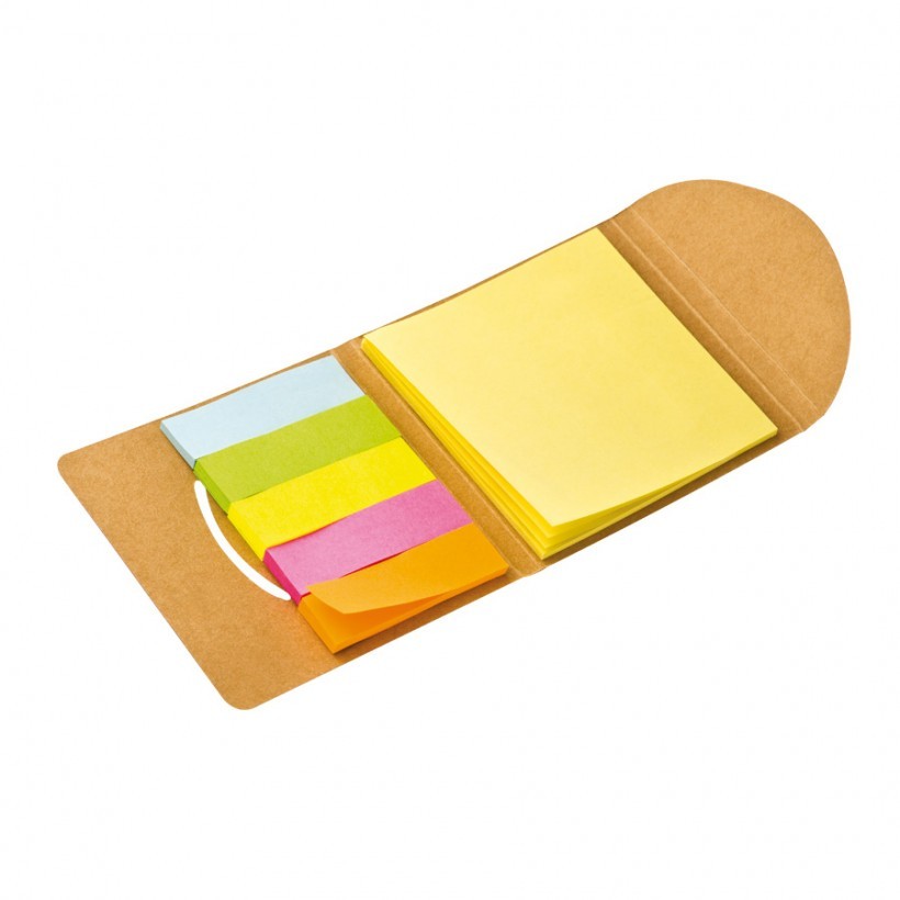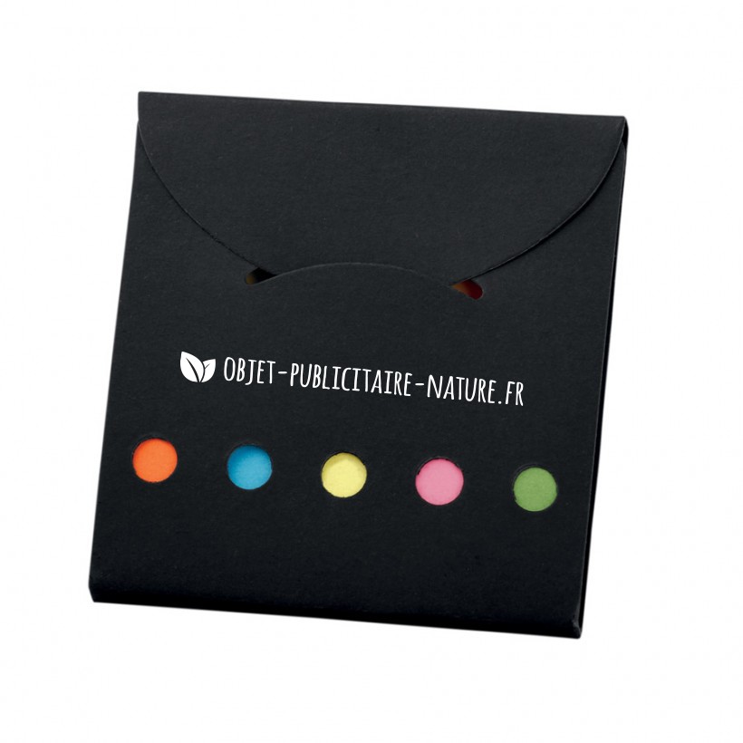 Etui publicitaire personnalisable cartonné, contient 150 mémos et marque-pages répartis dans 1 bloc mémo jaune et 5 blocs marque-pages repositionnables de différents coloris.