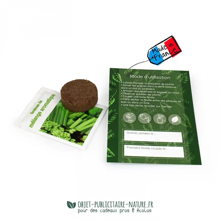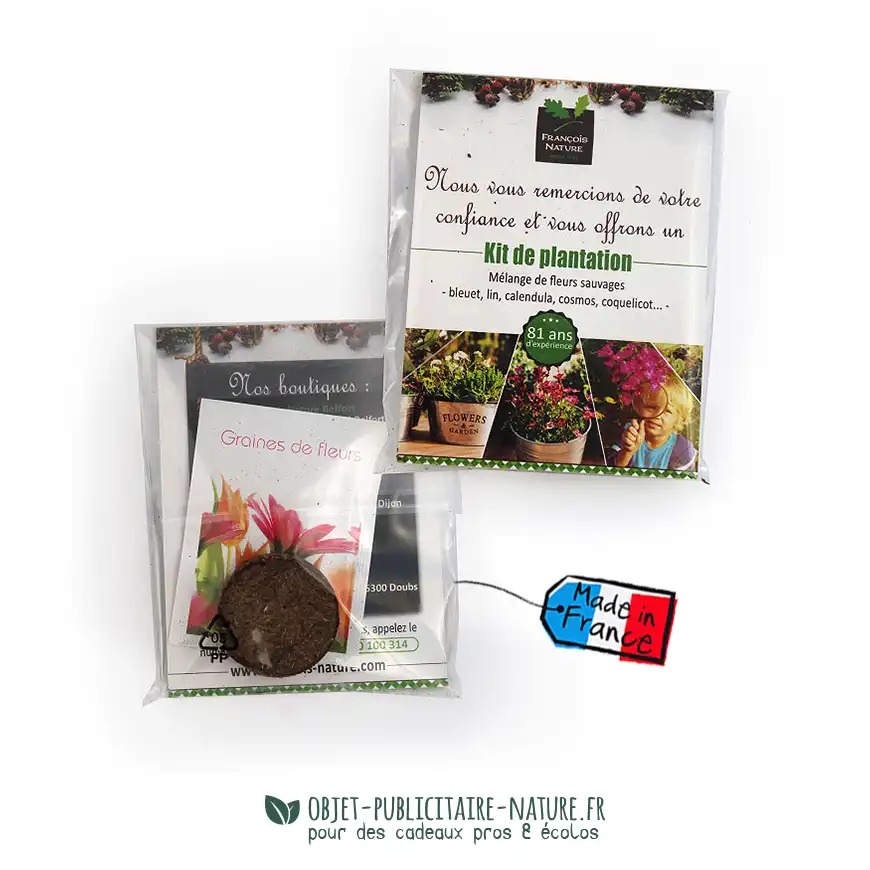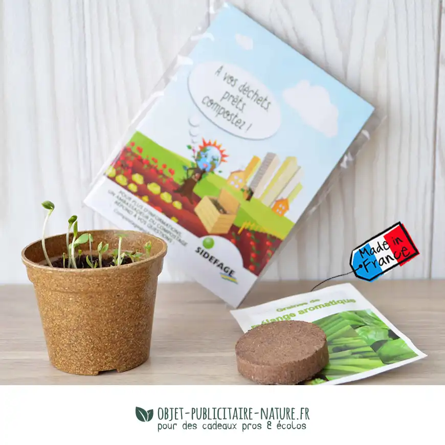 Ce kit de plantation publicitaire est livré sans contenant, le destinataire pourra choisir un contenant de son choix, petit pot, pot alimentaire de récupération…