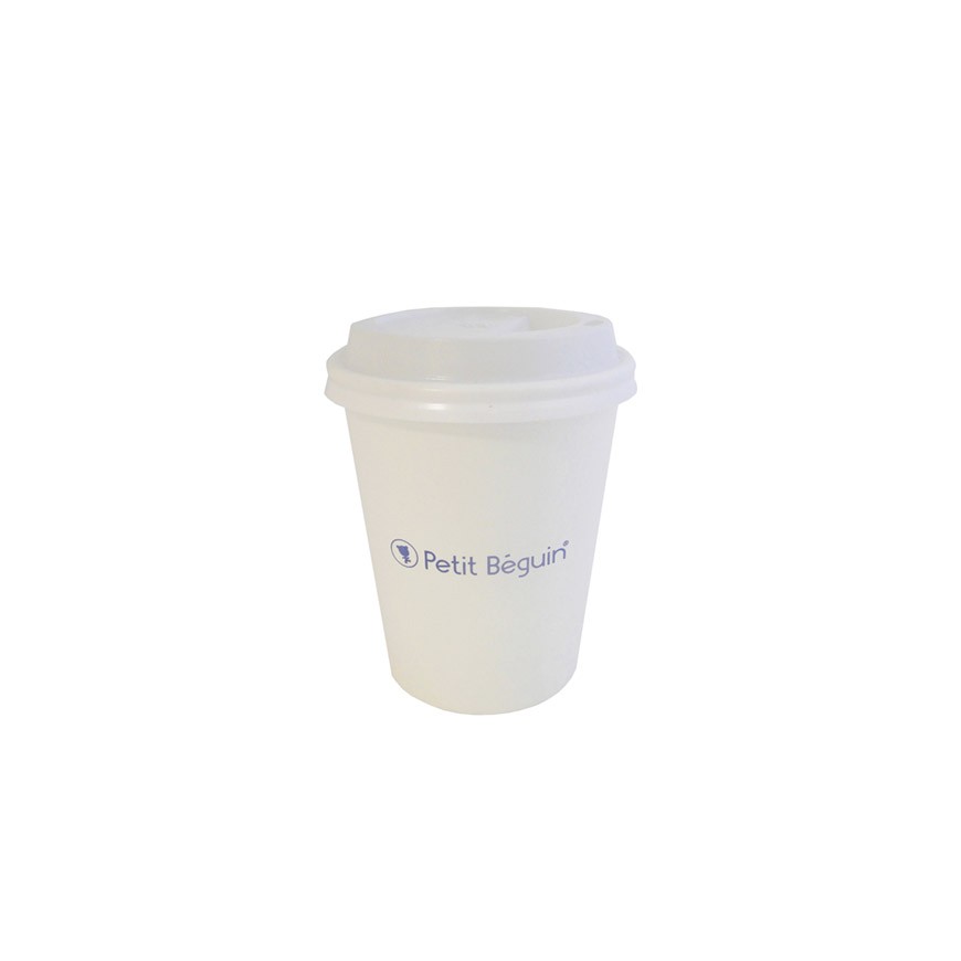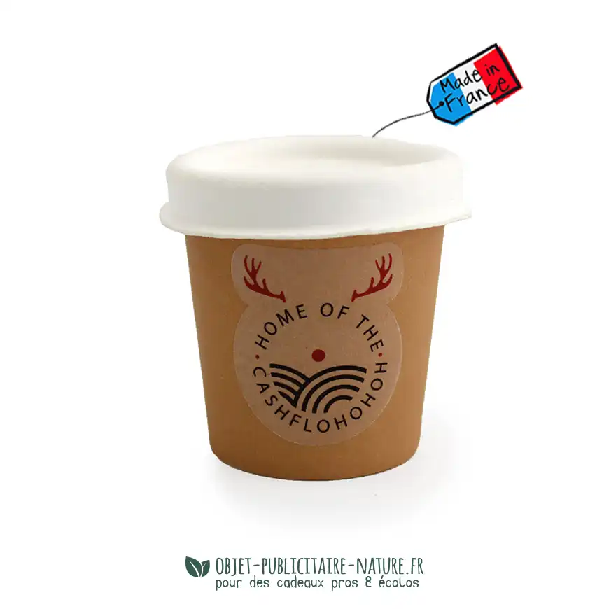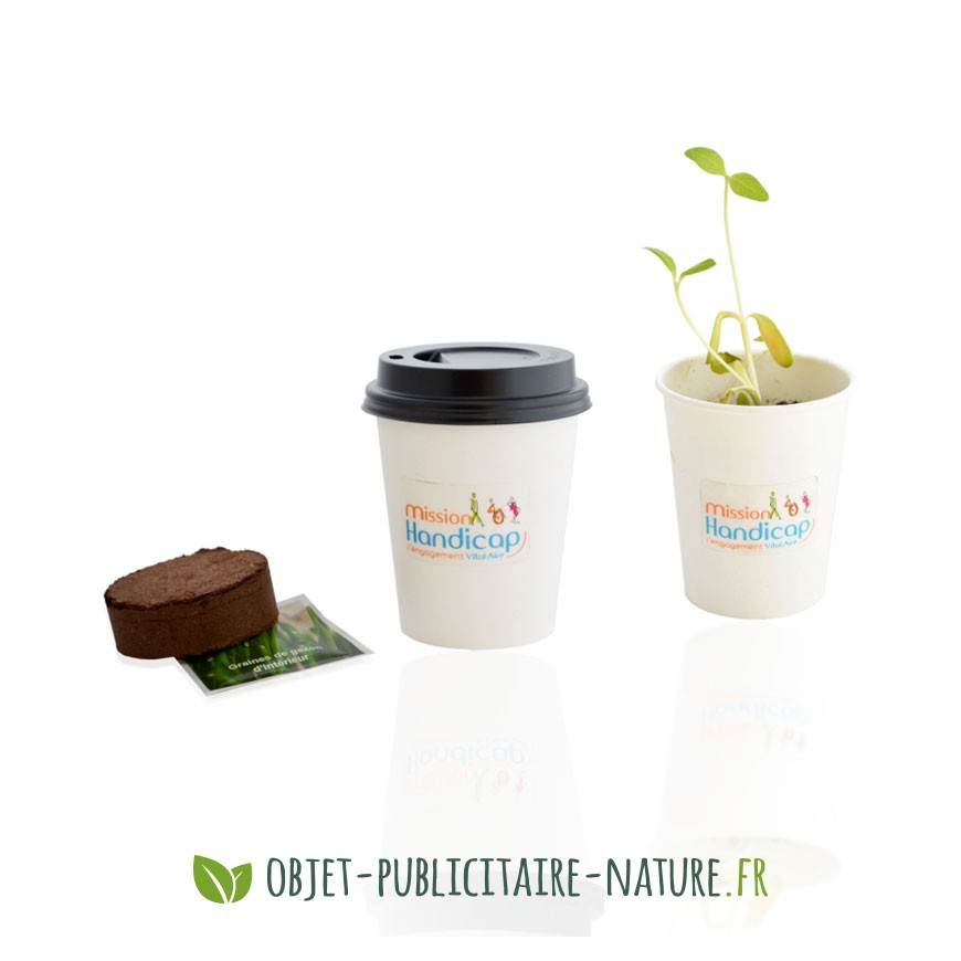 Le petit kit de plantation publicitaire en pot carton est fermé grâce à un couvercle, façon gobelet à café.
