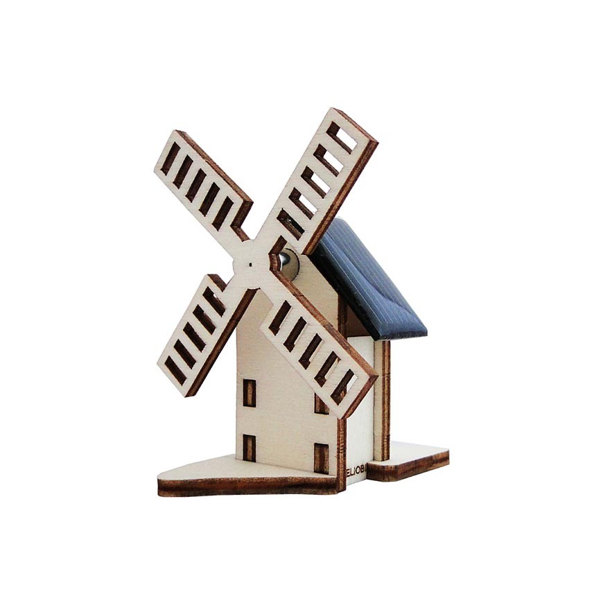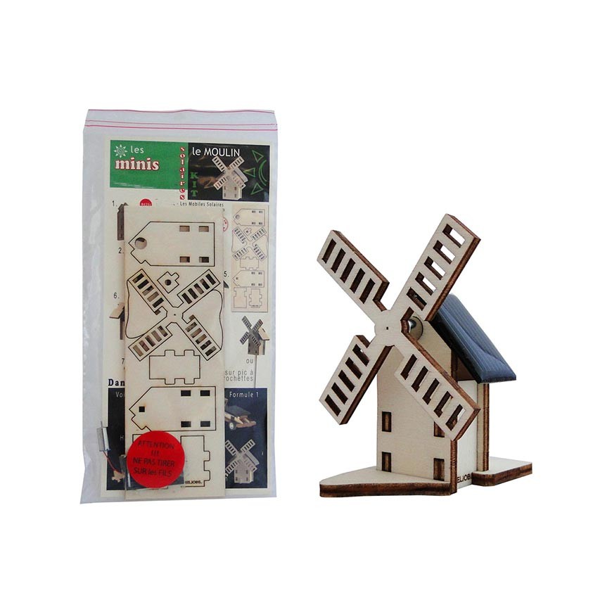 Petit moulin solaire en bois à personnaliser, équipé d’un capteur solaire et d’un moteur électrique.