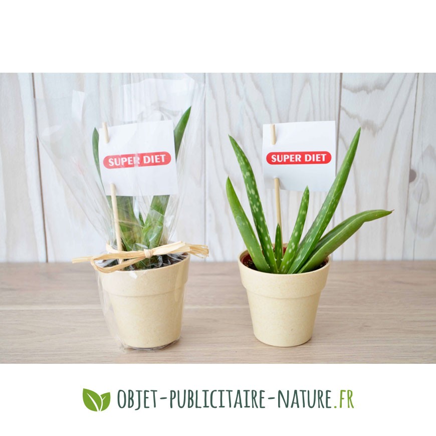 Plante publicitaire avec personnalisation par étiquette 5×5 cm recto verso, étiquette sur pic bois ou adhésif transparent.