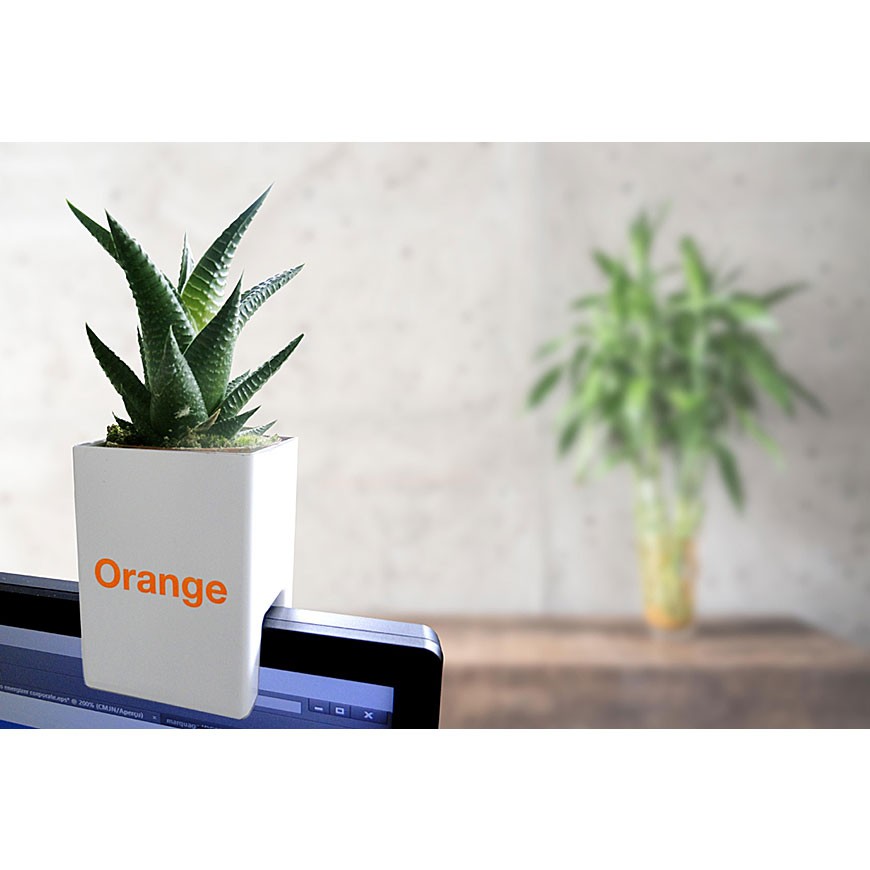Plante dépolluante publicitaire pot spécial ordinateur pour apporter un peu de nature au bureau.