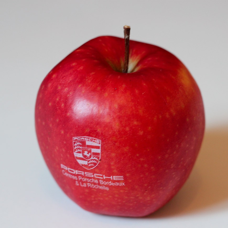Pas de marquage par laser ou gravure sur la pomme publicitaire pour une meilleure conservation du fruit.