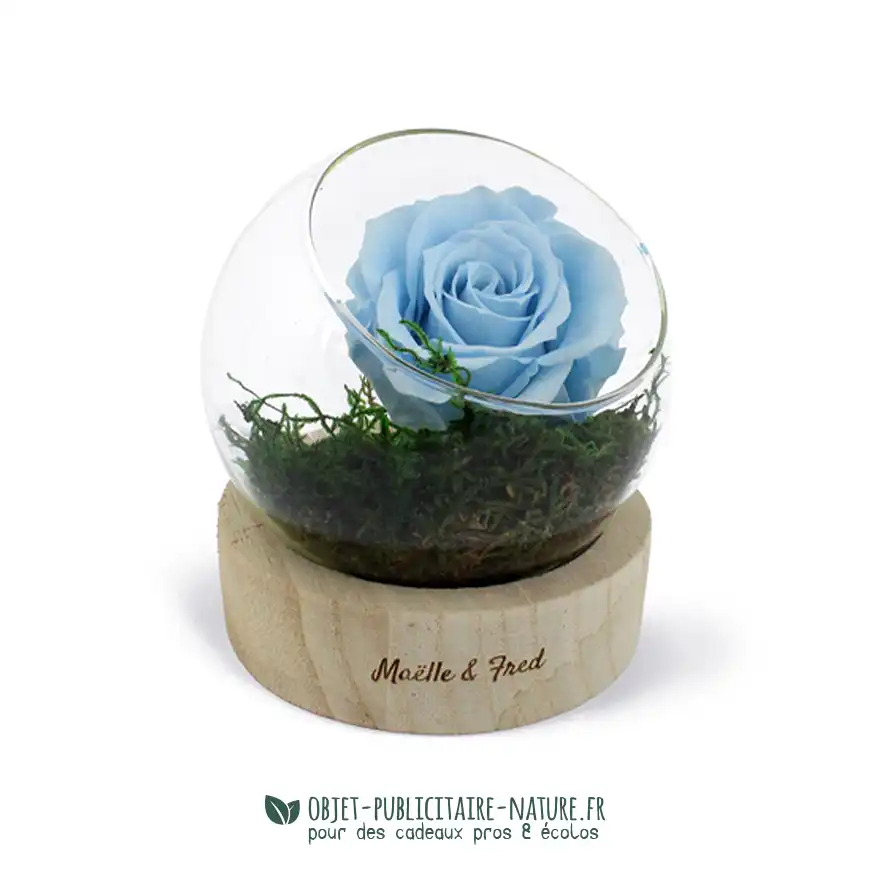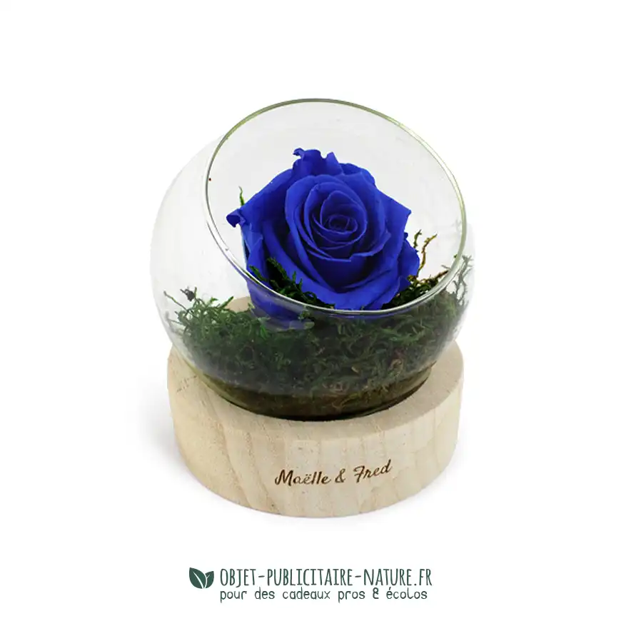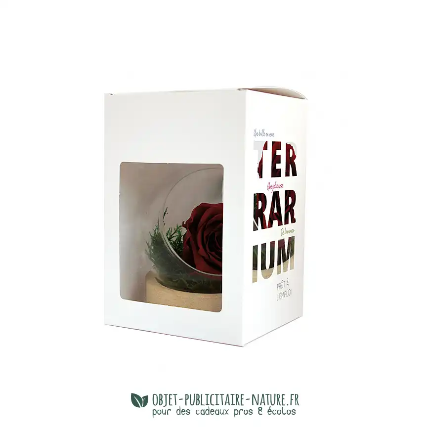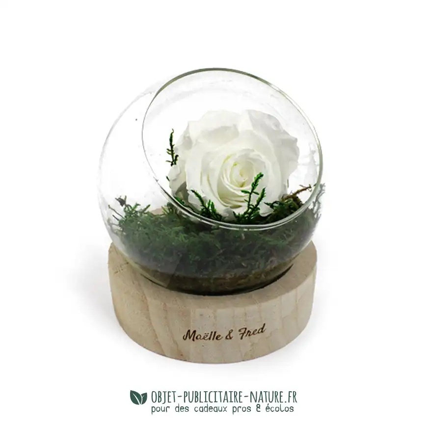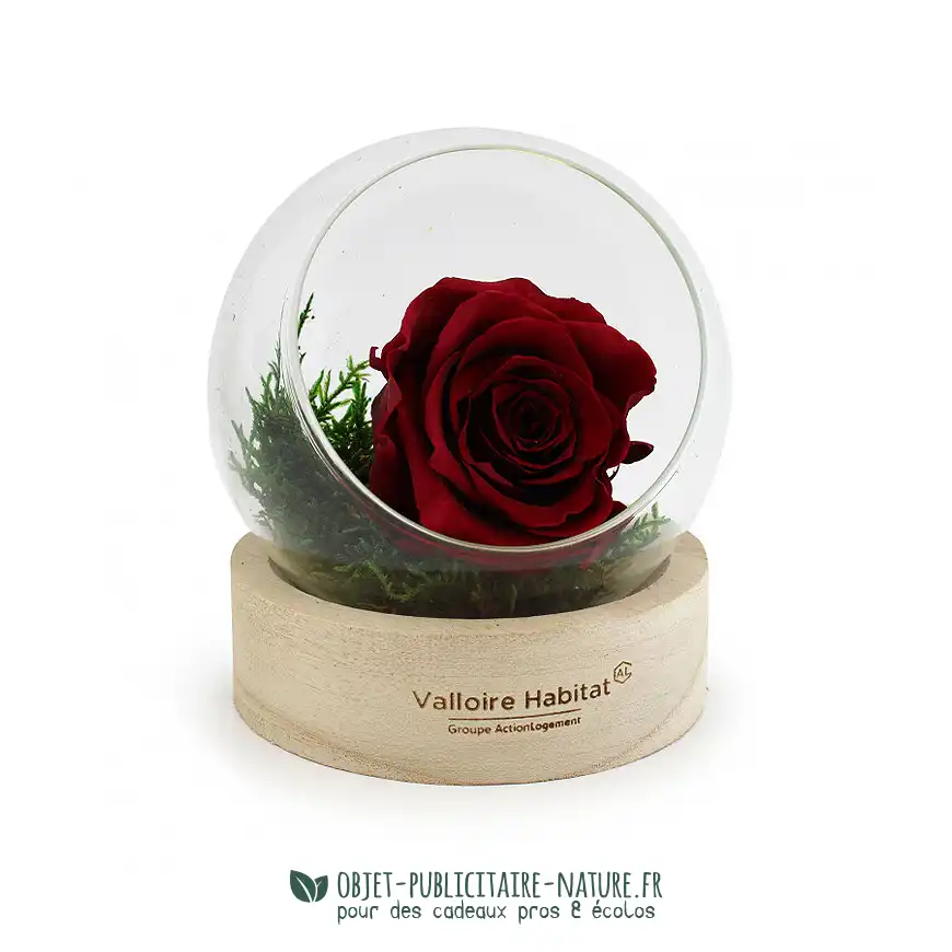 Tarifs de notre Rose éternelle dans terrarium publicitaire avec son socle en bois personnalisable