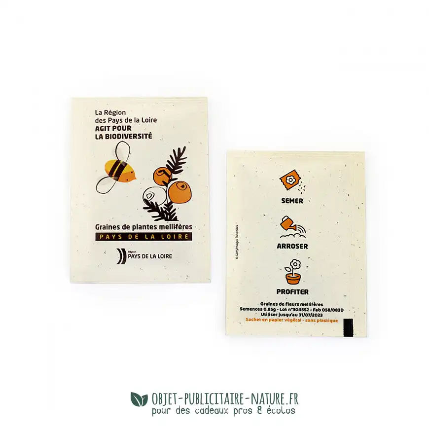 Sachet de graines personnalisable thermo-soudé avec une colle BIO donc étanche & sans plastique.