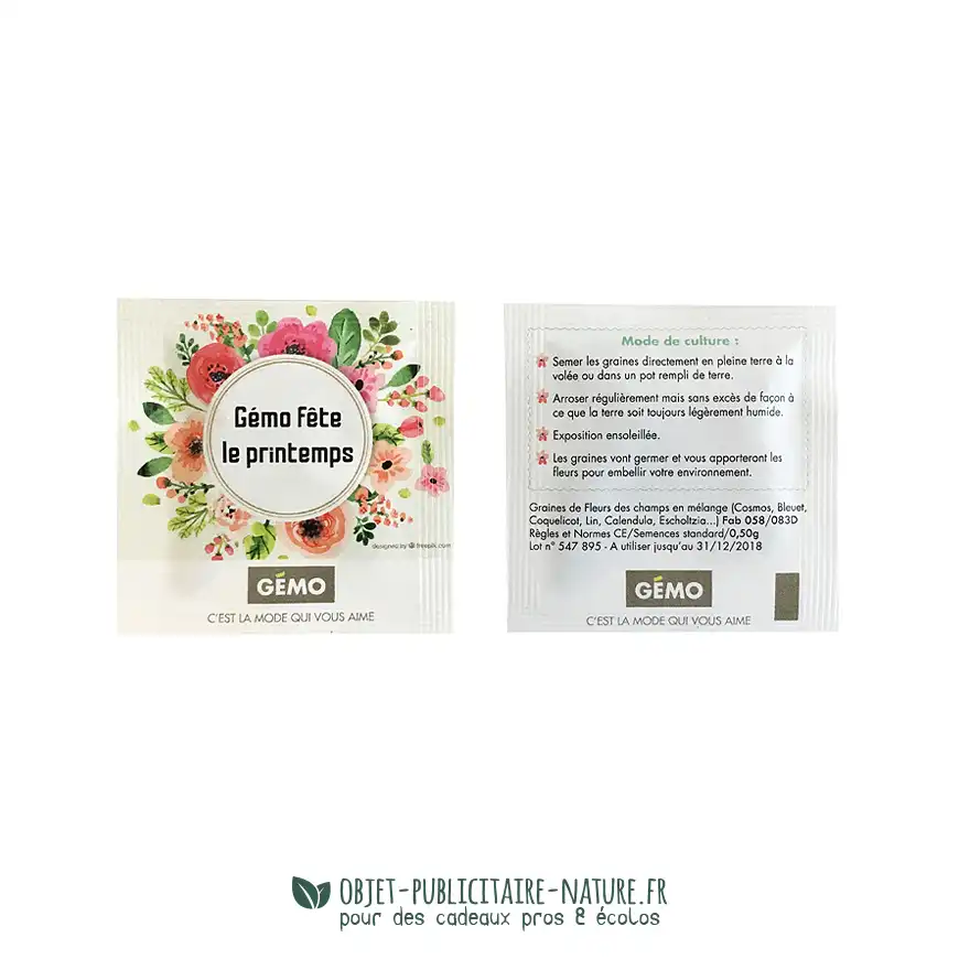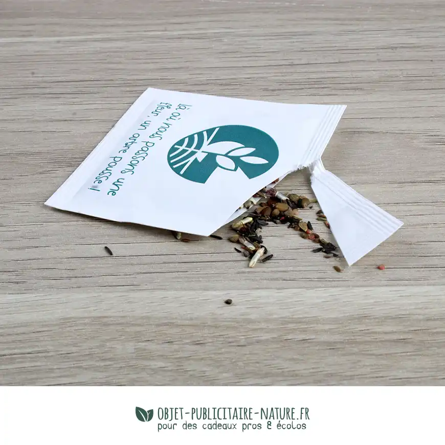 Le sachet de graines publicitaire est personnalisable par impression quadri ou 1 couleur, recto et verso.