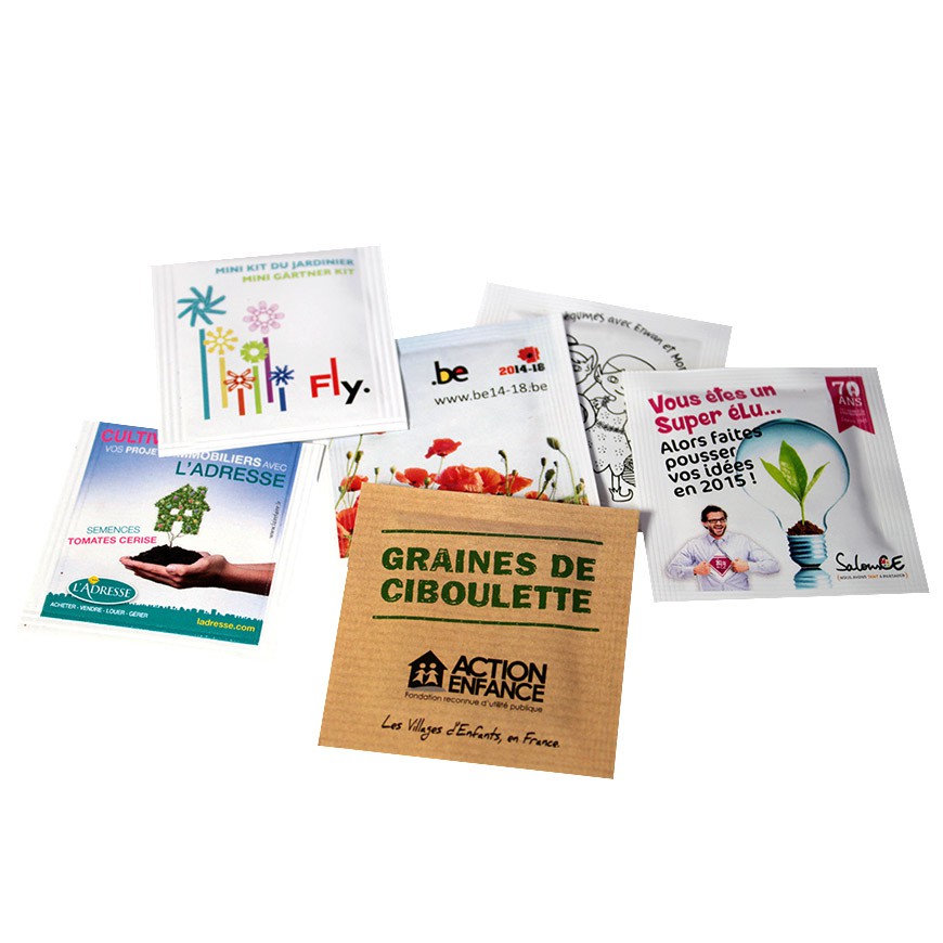 Offrir un sachet de graines publicitaire petit format 55×55 mm à vos clients c’est l’assurance de faire plaisir. Cadeau ludique, facile à distribuer, personnalisation complète et graines au choix !