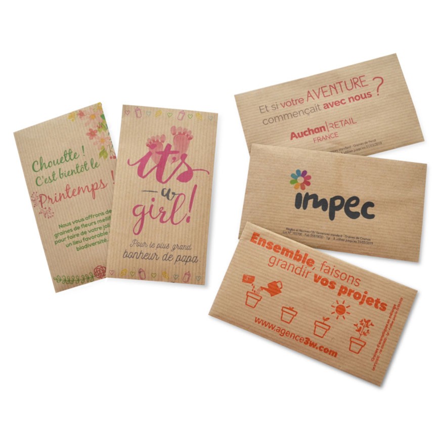 Sachet graines publicitaire papier kraft 70×120 mm personnalisable en quadrichromie.
