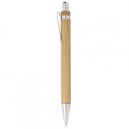 Stylo publicitaire personnalisable avec un corps en bambou, clip et poussoir métalliques. Mine au choix noire ou bleue.